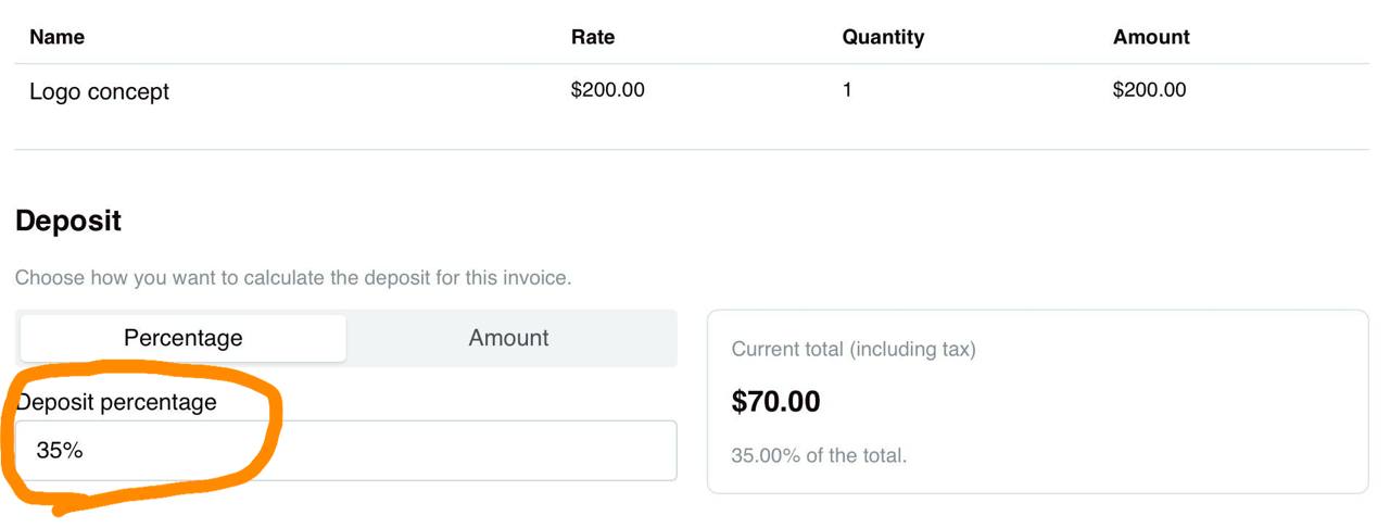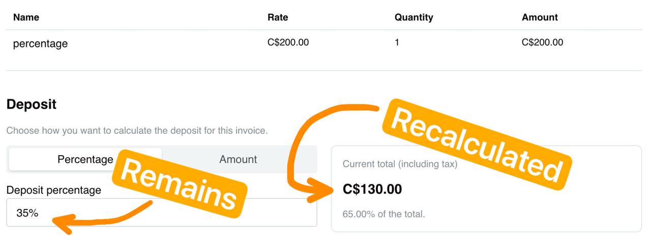 - Set your deposit payment percentage (e.g., 35% of the total)